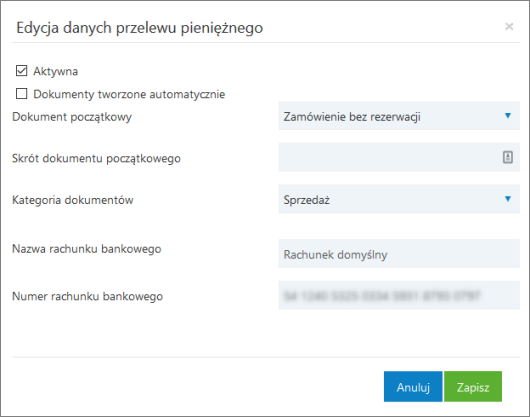 - znacznik Nazwa rachunku bankowego odpowiada za pobierany z systemu sprzedażowego GT lub nexo główny rachunek bankowy, uzupełniany podczas pracy kreatora, istnieje możliwość zmiany nazwy z poziomu Edycji danych Przelewu, ale tego typu informacje nie są przesyłane zwrotnie do programu sprzedażowego;