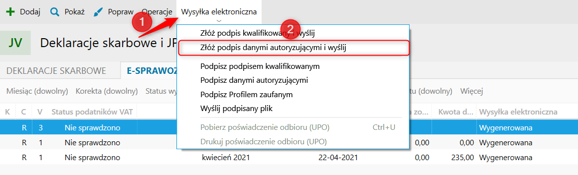 1. Wygenerować plik JPK. Taka czynność została opisana w innym temacie tutaj. Po stworzeniu pliku i zaznaczeniu go na liście należy kliknąć górne menu Wysyłka elektroniczna – Złóż podpis danymi autoryzującymi i wyślij.
