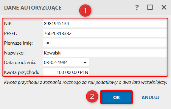 ​Podpisanie pliku JPK danymi autoryzującymi jest to metoda przeznaczona dla osób fizycznych, niewymagająca ani podpisu kwalifikowanego, ani posiadania profilu zaufanego. Dane nie muszą być w systemie - można podać je również ręcznie: NIP lub PESEL, imię, nazwisko, data urodzenia oraz odpowiednia kwota przychodu z zeznania rocznego za rok podatkowy o dwa lata wcześniejszy. W celu wysłania pliku kontrolnego należy: