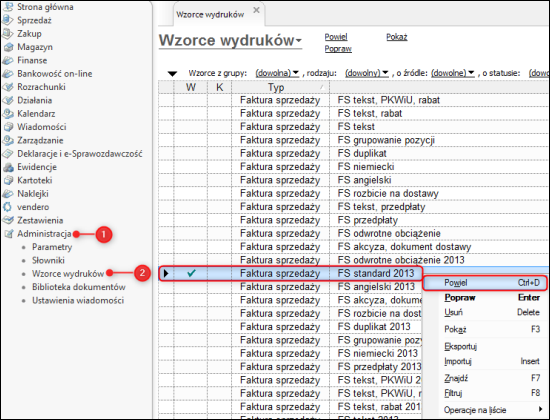 2. Przejść do modułu Administracja – Wzorce wydruków, odnaleźć wzorzec, który jest domyślnie używany (standardowo jest to FS/FZ Standard 2013), a następnie kliknąć go prawym przyciskiem myszy i wybrać opcję Powiel.