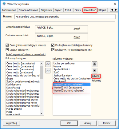 3. W oknie edycji wzorca wydruku przejść do zakładki Zawartość. W polu Kolumny wybrane zaznaczyć odpowiednią kolumnę, np. Wartość netto (z rabatem), pamiętając, że zmiana wykona się tylko dla aktualnie zaznaczonej kolumny, a następnie wybrać opcję Edycja.