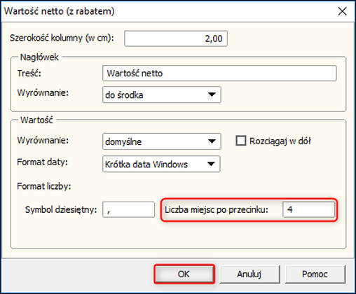 4. W kolejnym oknie zmienić wartość pola Liczba miejsc po przecinku. Zmiany zatwierdzić przyciskiem OK.
