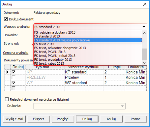 5. Aby wydrukować fakturę z dodatkowymi miejscami po przecinku, należy w oknie wydruku zmienić wzorzec na wcześniej przygotowany lub ustawić go jako domyślny.