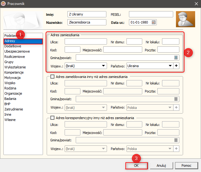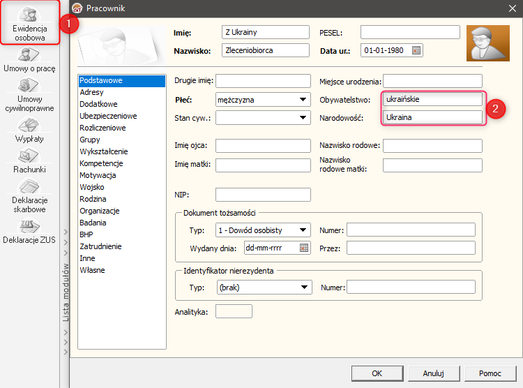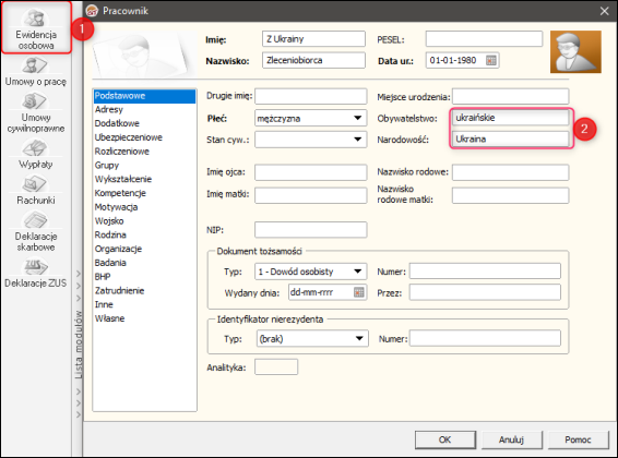 1. W Ewidencji osobowej w kartotece tego zleceniobiorcy w sekcji Podstawowe ustawić Obywatelstwo oraz Narodowość.