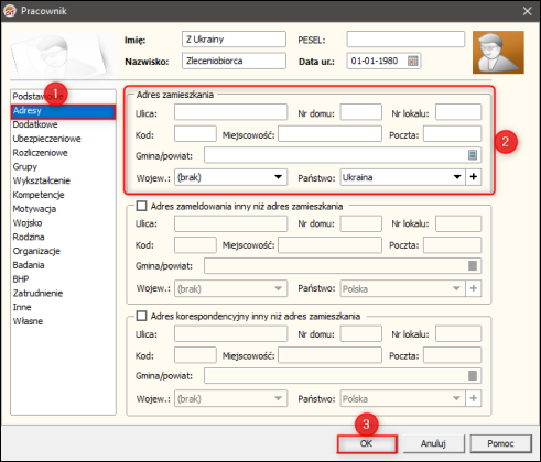 2. W sekcji Adresy należy wypełnić adres zamieszkania. Po wykonaniu tej czynności można uzupełnić inne dane w kartotece pracownika. Po zakończeniu wprowadzania zmian zapisać przyciskiem OK.