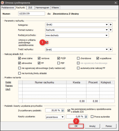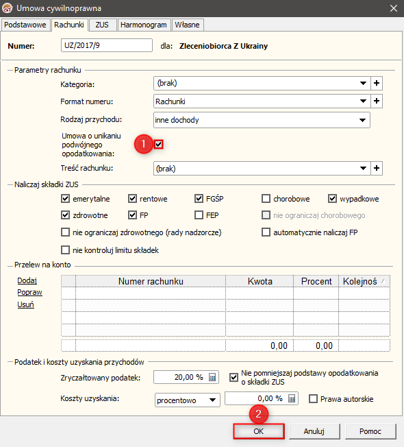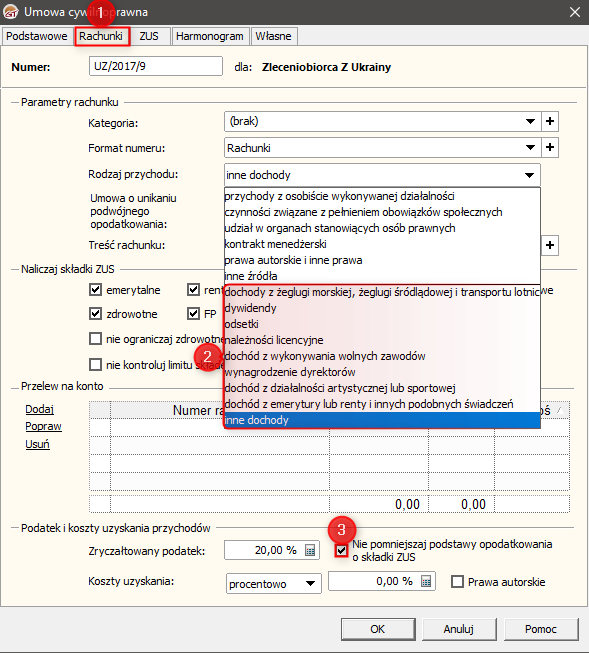 3. Na umowie cywilnoprawnej dla tego obcokrajowca należy na zakładce Rachunki w polu Rodzaj przychodu wybrać rodzaj spod poziomej kreski. Po wybraniu rodzaju przychodu zaznaczyć checkbox Nie pomniejszaj podstawy opodatkowania o składki ZUS.