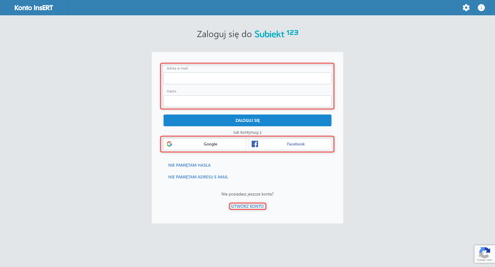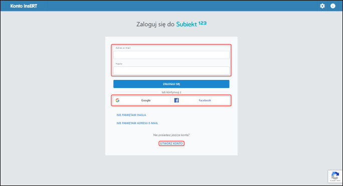 2. Zalogować się do Konta InsERT. W przypadku braku konta należy skorzystać z opcji Utwórz konto lub zalogować się przez Facebooka, bądź konto Google. Na stronie rejestracji nowego konta podać wszystkie wymagane dane. Nowo założone konto wymaga potwierdzenia. Na adres e-mail wprowadzony na stronie rejestracji wysłany zostanie link aktywacyjny. Potwierdzić konto, klikając w otrzymany link aktywacyjny. Po tej operacji możliwe będzie zalogowanie do serwisu.​