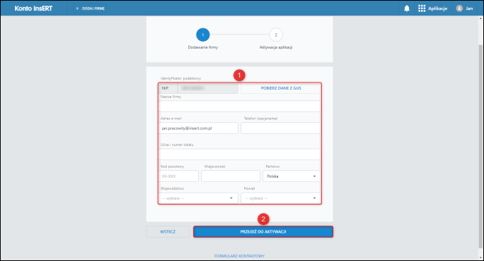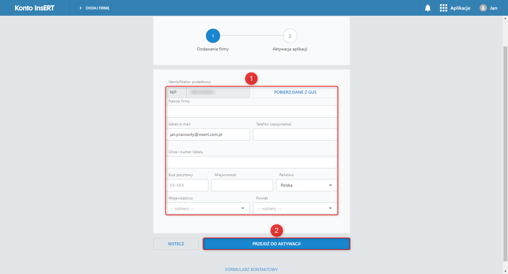 4. Pobrać dane z GUS lub ręcznie wprowadzić dane firmy i Przejść do aktywacji.
