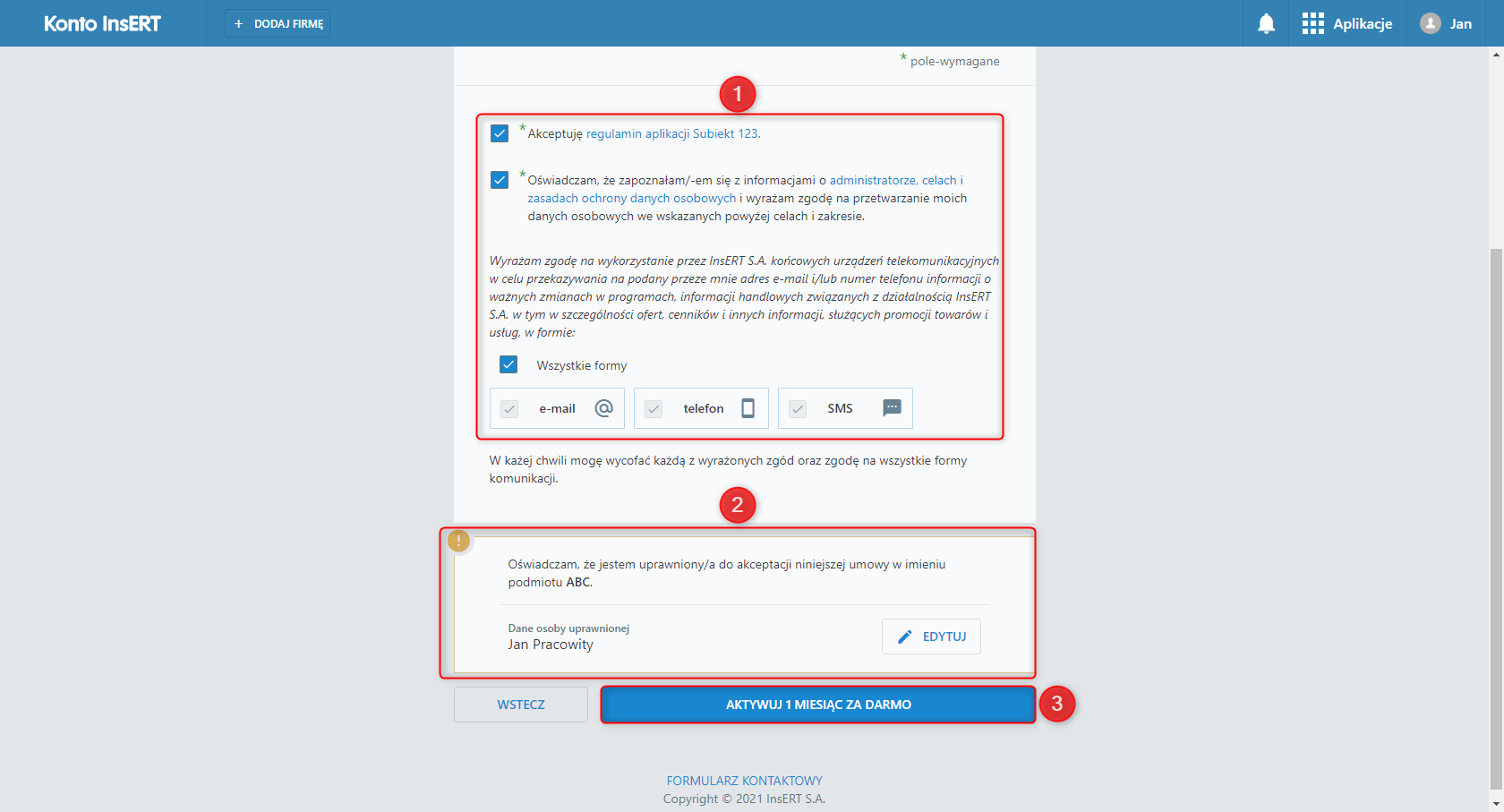 5. Zapoznać się z regulaminem oraz oświadczeniem, wskazać sposób przekazywania przez firmę InsERT informacji o ważnych zmianach w programach, informacji handlowych związanych z działalnością InsERT S.A, zweryfikować oświadczenie i dane osoby uprawnionej do akceptacji umowy, następnie kliknąć Aktywuj 1 miesiąc za darmo.