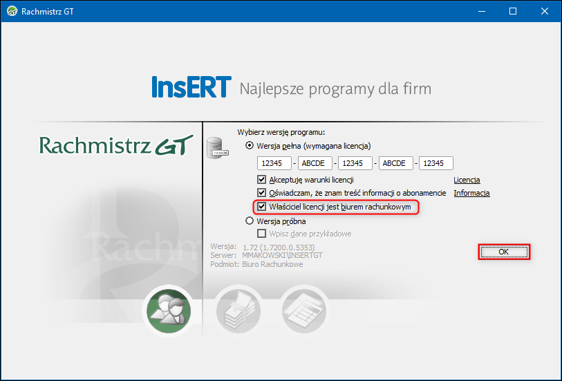 2. Zaznaczyć znacznik Wersja pełna (wymagana licencja) i wpisać numer licencji programu. Zapoznać się z warunkami licencji, informacją o abonamencie oraz zaznaczyć znacznik Właściciel licencji jest biurem rachunkowym. Spowoduje to, że ewentualne inne programy dla tego podmiotu również będą musiały być zarejestrowane na licencji biura rachunkowego.