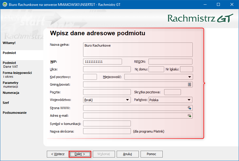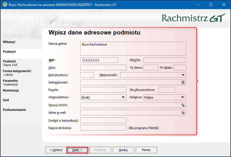 3. Wypełnić dane podmiotu przechodząc przez kreator wdrożeniowy.