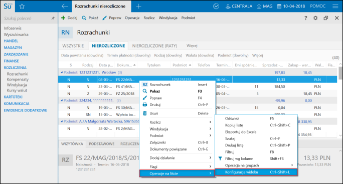 1. Przejść do wybranego modułu, a następnie kliknąć prawym przyciskiem myszy w dowolnym miejscu widocznej listy i wybrać opcję Operacje na liście – Konfiguracja widoku.