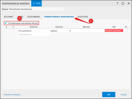 2. Zakładka Formatowanie warunkowe służy do wyróżniania wierszy po spełnieniu wybranych warunków, aby z niego skorzystać, należy zaznaczyć opcję Formatowanie warunkowe wierszy. W podanym przykładnie wszystkie rozrachunki, które posiadają spóźnienie w spłacie, zostaną oznaczone na czerwono.