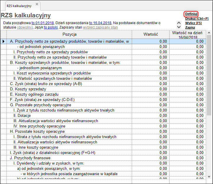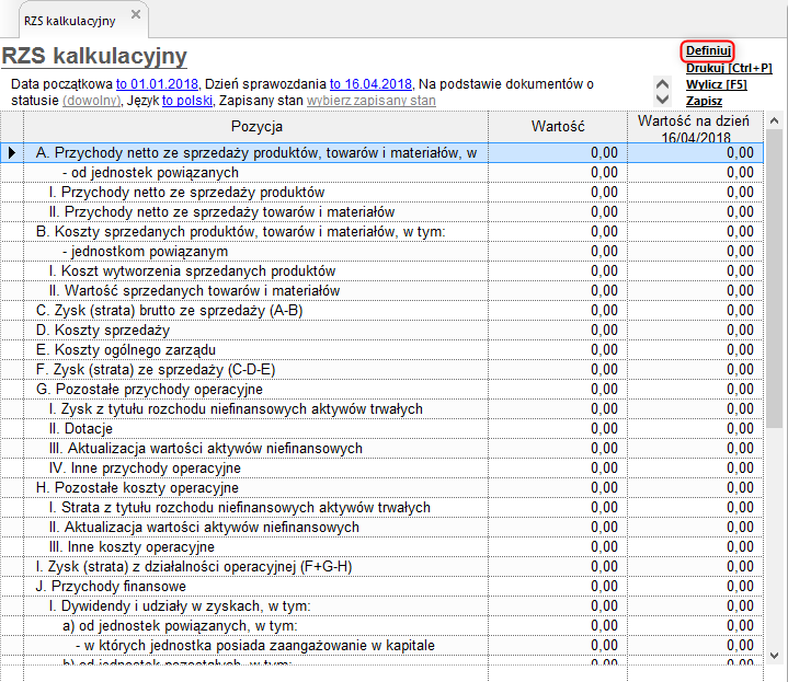2. W prawym górnym rogu sprawozdania kliknąć opcję Definiuj.