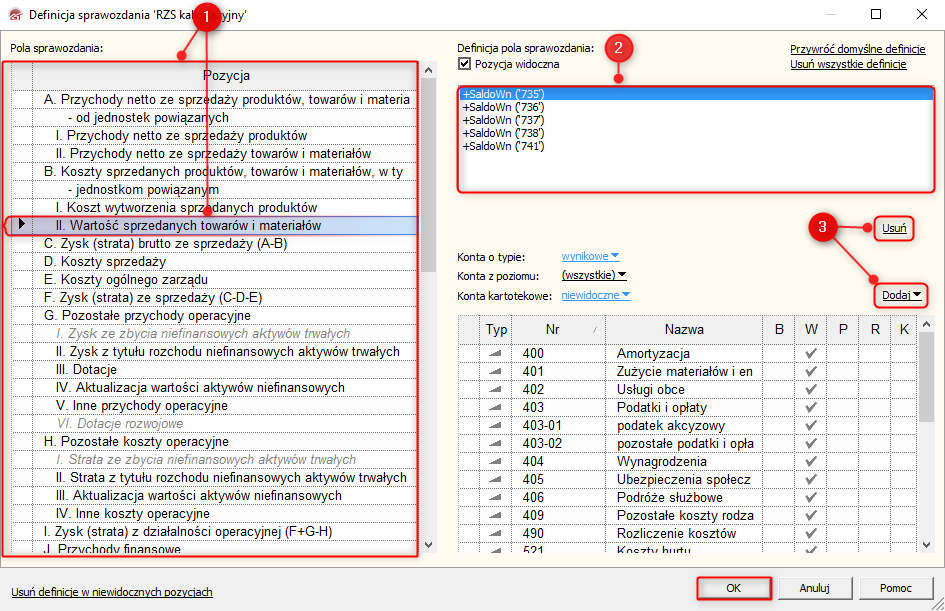 3. W oknie Definicja sprawozdania, w tabeli Pole sprawozdania, zaznaczyć pozycję, której definicja będzie edytowana (1). W okienku po prawej stronie pokaże się definicja zaznaczonego pola (2), którą można edytować za pomocą przycisków (3) Dodaj oraz Usuń.