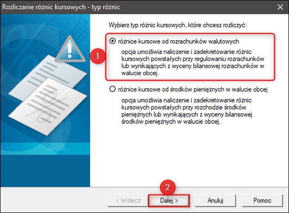 2. W oknie, które się wyświetli określić typ różnic jako różnice kursowe od rozrachunków walutowych i wcisnąć przycisk Dalej.