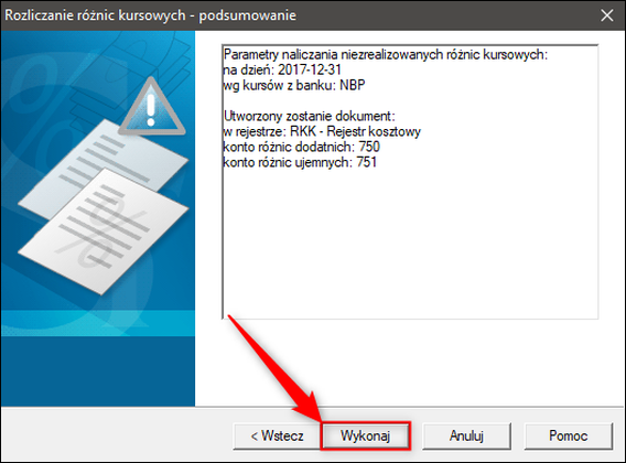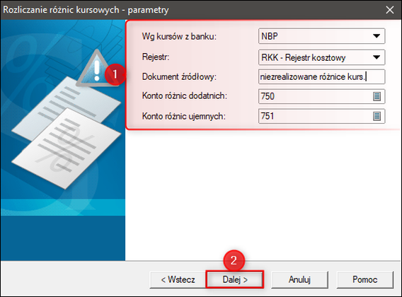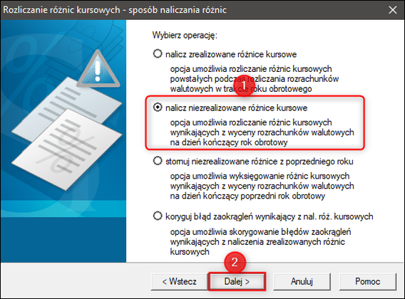 3. W następnym kroku określić sposób naliczania różnic jako nalicz niezrealizowane różnice kursowe i przejść Dalej.