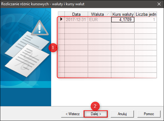5. W następnym kroku wprowadzić kursy na dzień 31 grudnia i przejść Dalej.
