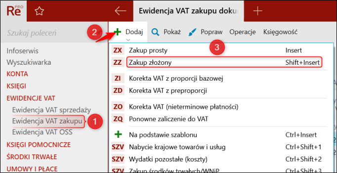 1. Przejść do modułu Ewidencja VAT zakupu na zakładkę Ewidencja VAT zakupu dokumenty i wybrać z górnego menu Dodaj  Zakup złożony.