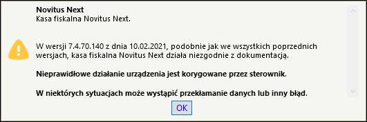 Kasa fiskalna Novitus Next działa niezgodnie z dokumentacją, dlatego przy konfigurowaniu tego urządzenia program informuje o problemach w następujący sposób: