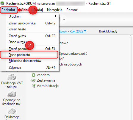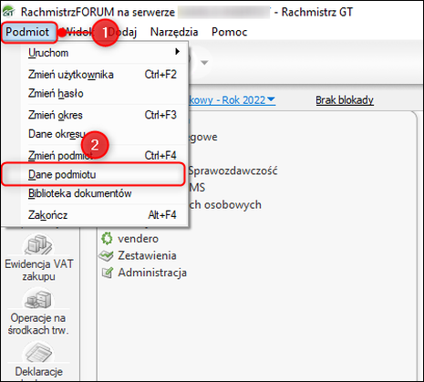 1. Otworzyć górne menu Podmiot – Dane podmiotu.