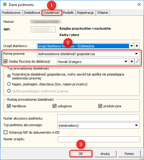 Jedną z najczęstszych przyczyn błędnie wystawionej deklaracji jest zła konfiguracja Danych podmiotu pod względem prowadzonej działalności. Aby edytować te dane, należy: