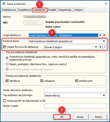 2. Przejść do zakładki Działalność i wskazać formę prawną. Jeżeli deklaracje wystawiane są na osobę fizyczną, to należy zaznaczyć opcję Osoba fizyczna do deklaracji i w polu wskazać kartotekę Wspólnika (właściciela). Edycję danych zatwierdzić przyciskiem OK.