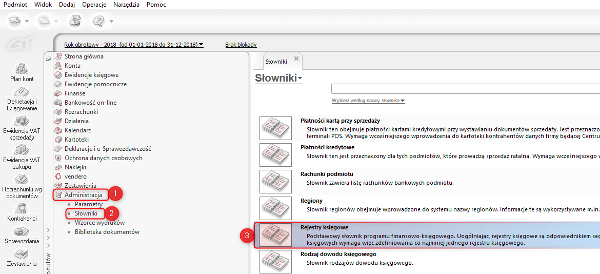 1. Z listy modułów wybrać Administracja – Słowniki i z listy słowników wybrać Rejestry księgowe.