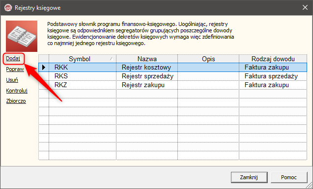 Program Rewizor GT zapisuje dekrety (dokumenty księgowe) w konkretnych rejestrach księgowych. Mogą być one tworzone według rodzajów (np. rejestr sprzedaży, zakupu, kosztowy), okresu (np. rejestr styczeń 2018, luty 2018 itd.) lub w inny dowolny sposób. Aby dodać nowy rejestr księgowy, należy: