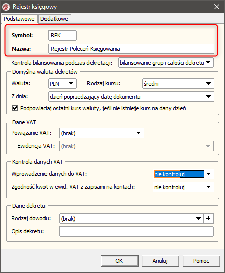 5. Uzupełniając sekcję Dane VAT, domyślnie przy wybraniu tego rejestru księgowego dekret będzie tworzył powiązany zapis do ewidencji VAT zakupu lub sprzedaży (pole powiązanie VAT). Włączając powiązanie VAT, należy określić, do jakiej ewidencji (rejestru) VAT ma domyślnie trafiać zapis (pole Ewidencja VAT).