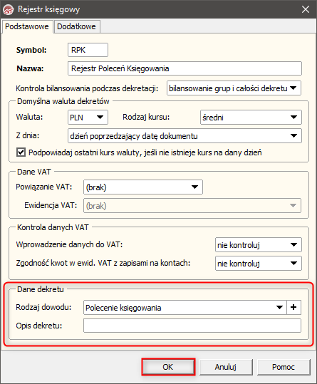 8. Sekcja Dane dekretu umożliwia wybranie domyślnego rodzaju dowodu oraz opisu dekretu. Po wprowadzeniu wszystkich danych nowy rejestr zapisać przyciskiem OK.