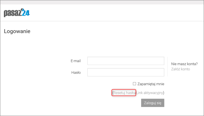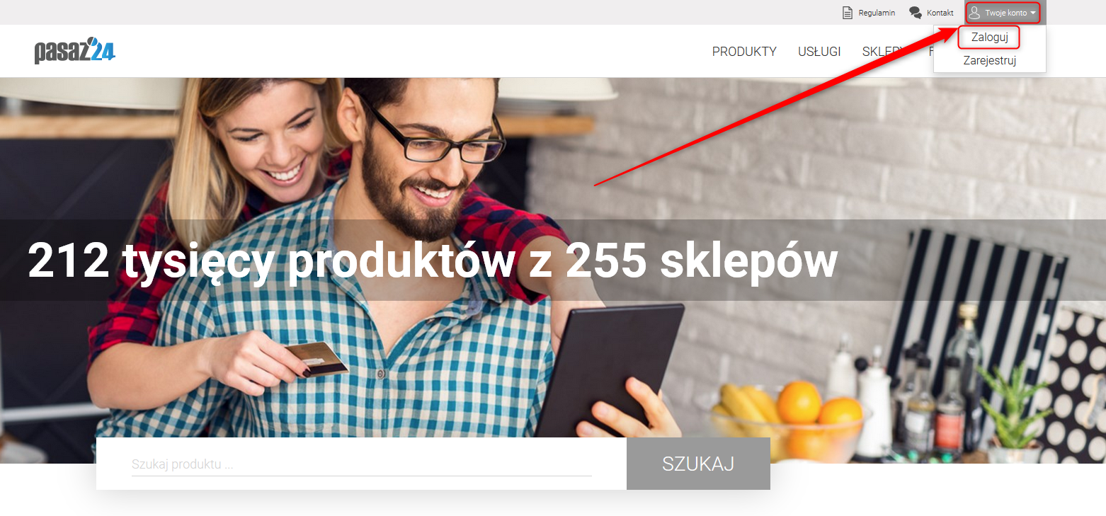 Posiadając dostęp do wspomnianego adresu mailowego wystarczy przejść na stronę pasaz24.pl, a następnie w prawym górnym rogu wybrać z menu Twoje konto - Zaloguj.