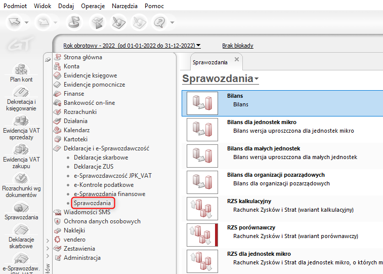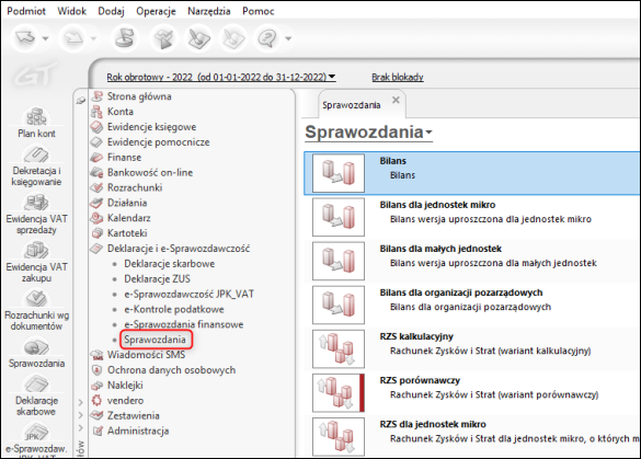 Moduł umożliwiający wygenerowanie m.in.: Bilansu oraz Rachunku zysków i strat. Dodatkowo można w nim zdefiniować pola deklaracji Zaliczka miesięczna PIT/CIT oraz załączników CIT-8/O i CIT-BR.