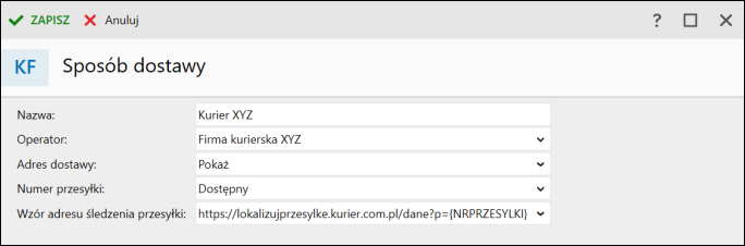 2. Wypisać Nazwę, Operatora, ustalić, czy Adres dostawy ma zostać pokazany oraz określić, czy Numer przesyłki będzie wymagany, zalecany, czy dostępny. W polu Wzór adresu śledzenia przesyłki wpisać przykładowy adres strony do lokalizacji paczki u operatora, w którym należy umiejscowić ciąg znaków {NRPRZESYLKI}, np.: https://lokalizujprzesylke.kurier.com.pl/dane?p={NRPRZESYLKI}.