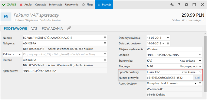 3. Na dokumencie handlowym wskazać stworzony Sposób dostawy oraz wpisać Numer przesyłki. Przycisk Link automatycznie przekieruje na stronę internetową do śledzenia przesyłki.