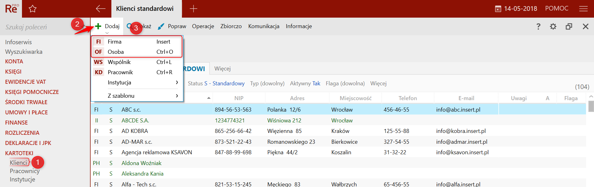 Aby dodać nowego klienta, należy przejść do modułu Klienci, kliknąć górne menu Dodaj i wybrać jedną z istniejących możliwości.