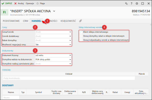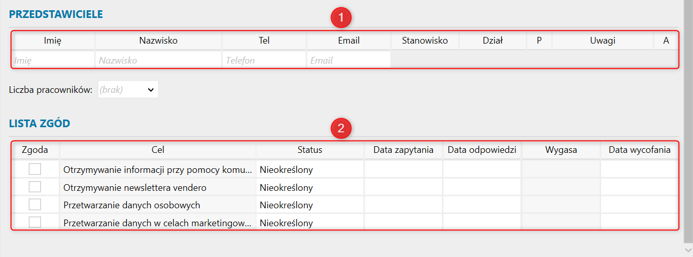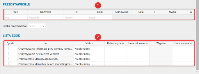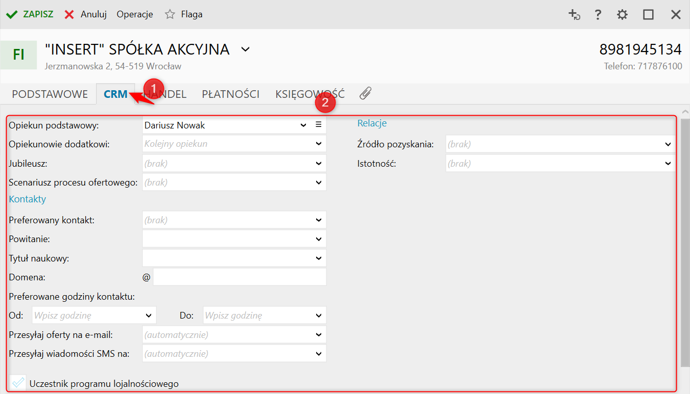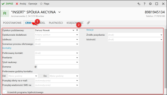 CRM – w tej zakładce można określić bardzo wiele informacji dotyczących zarządzania kontaktami z klientem m.in. Opiekunów, Preferowany kontakt, Przedstawicieli i różnego rodzaju Zgody.