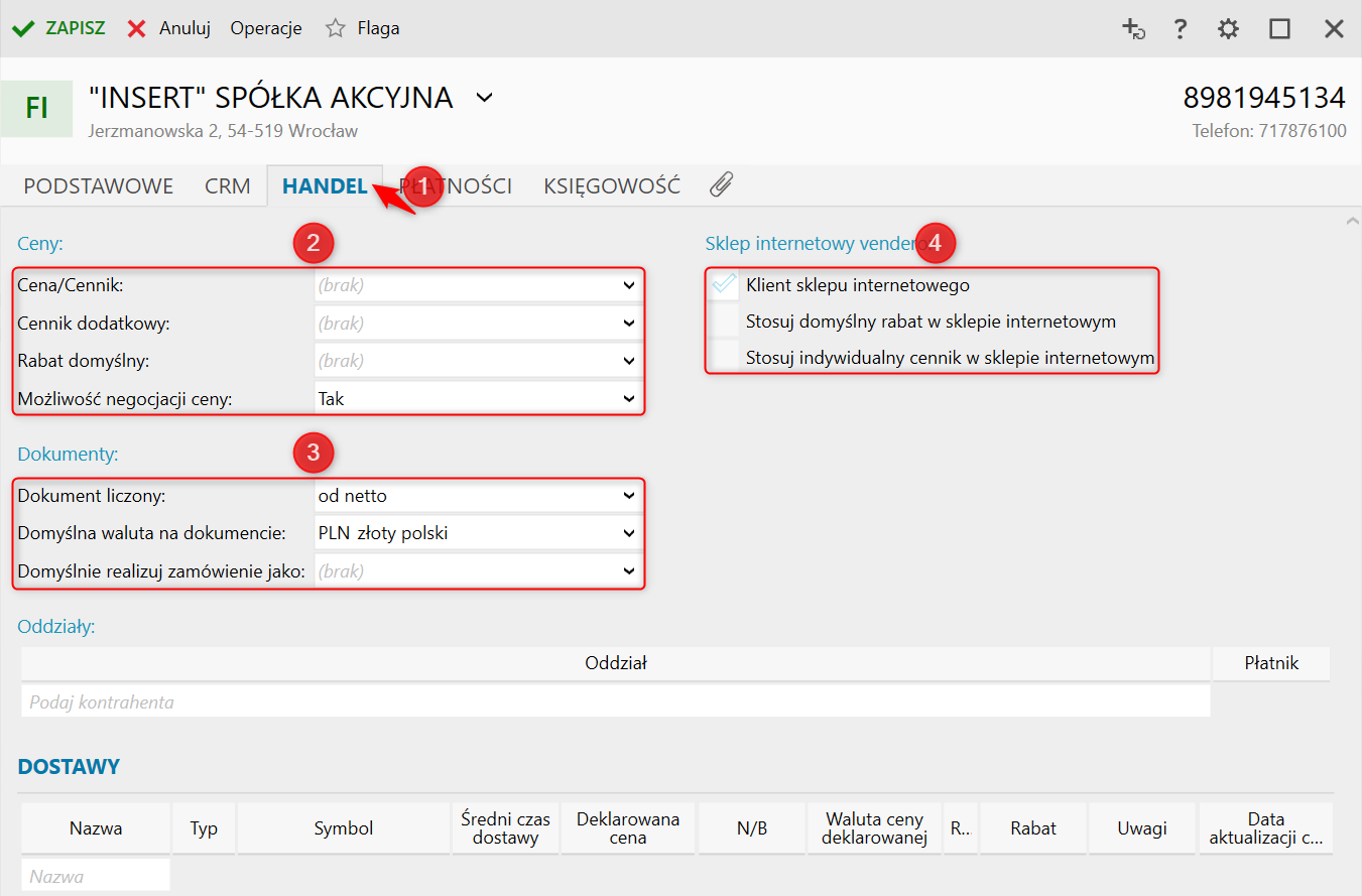 Handel – warto zwrócić uwagę na tę zakładkę w przypadku posiadania programu Subiekt nexo na tej samej bazie danych. W tej zakładce można przede wszystkim ustawić domyślny Cennik, Rabat i Możliwość negocjacji ceny, ponadto można ustawić, w jaki sposób ma być przeliczany dokument oraz oznaczyć opcje dotyczące sklepu internetowego – Vendero.
