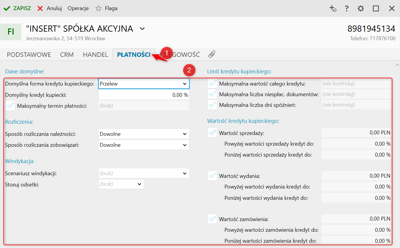 - Płatności – na tej zakładce można określić opcje dotyczące Kredytu kupieckiego, Rozliczeń i Windykacji.