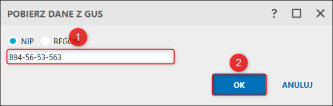 Przy dodawaniu kartoteki typu Firma warto zwrócić uwagę na możliwość uzupełnienia danych z GUS. W przypadku korzystania z wyszukiwarki GUS (można to ustawić w konfiguracji Pobieranie danych klienta), w oknie Pobierz dane z GUS wystarczy uzupełnić NIP i zatwierdzić przyciskiem OK.