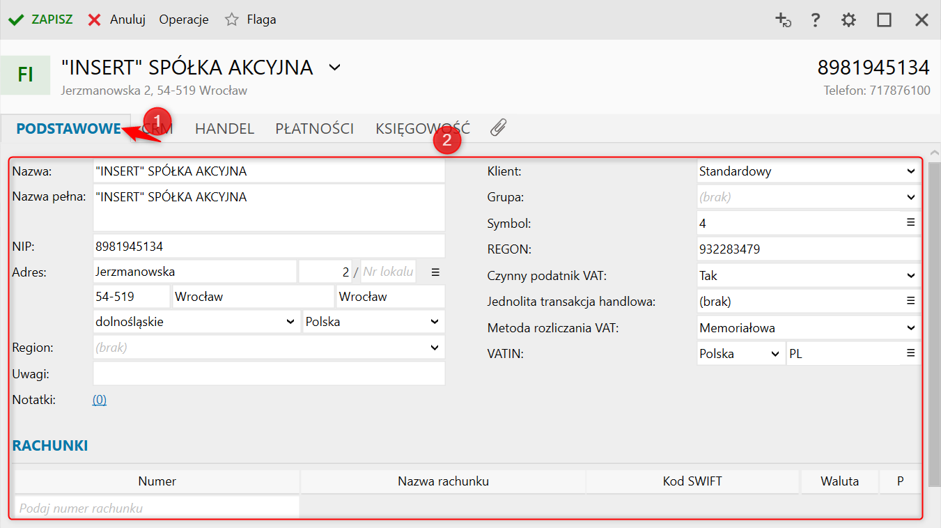 Podstawowe – w której można wpisać dane adresowe, kontaktowe i firmy oraz uzupełnić Rachunki. Ponadto można przypisać różnego rodzaju Notatki, wybrać Cechy i Branże.