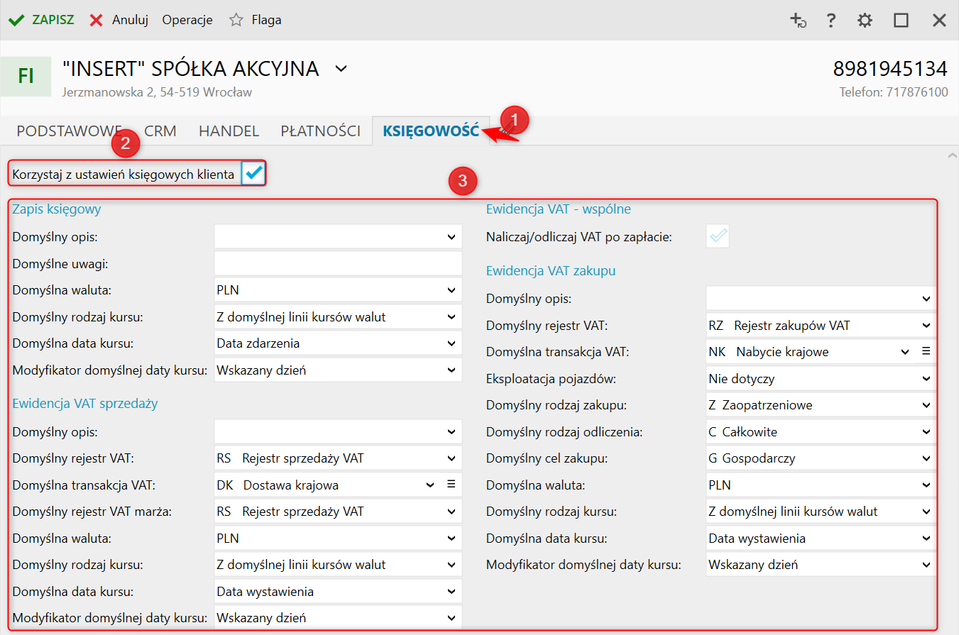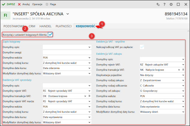 Księgowość – w sekcji tej, po zaznaczeniu Korzystaj z ustawień księgowych klient, użytkownik może przypisywać klientom wartości księgowe, które będą kopiowane do dekretu bądź zapisu VAT, kiedy ten kontrahent zostanie użyty, domyślny opis zdarzenia gospodarczego oraz uwagi do zapisu księgowego, domyślna transakcja VAT, rodzaj zakupu bądź odliczenia, które wykorzystane mogą być podczas dekretacji ręcznej zapisów księgowych, bądź VAT. W przypadku niezaznaczonej opcji Korzystaj z ustawień księgowych klienta ustalenia te wprowadza się w Parametrach dostępności ustawień księgowych – dla wszystkich klientów zbiorczo.