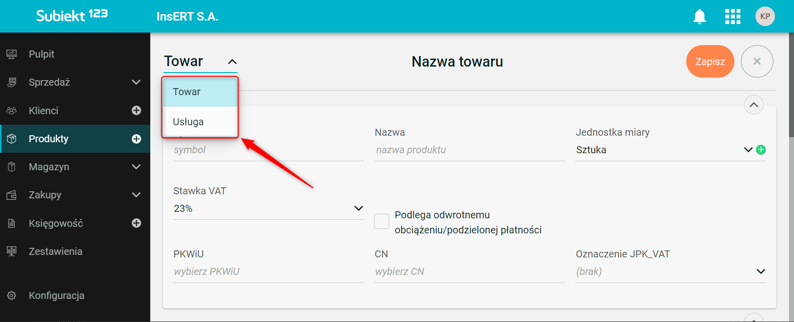 2. W lewym górnym rogu określić, czy dodawany będzie Towar, czy Usługa.