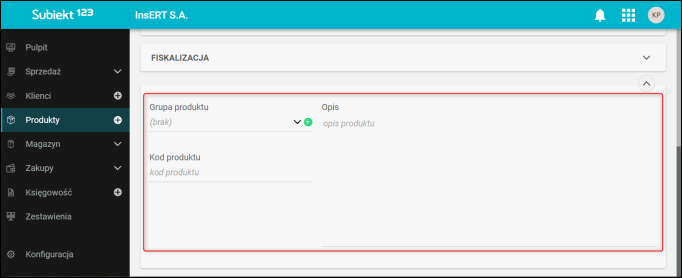 7. W sekcji Pozostałe do uzupełnienia udostępniono Grupę, Kod, oraz Opis produktu.