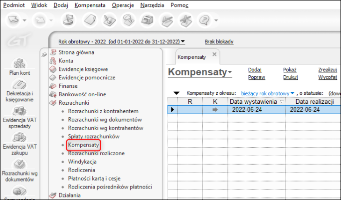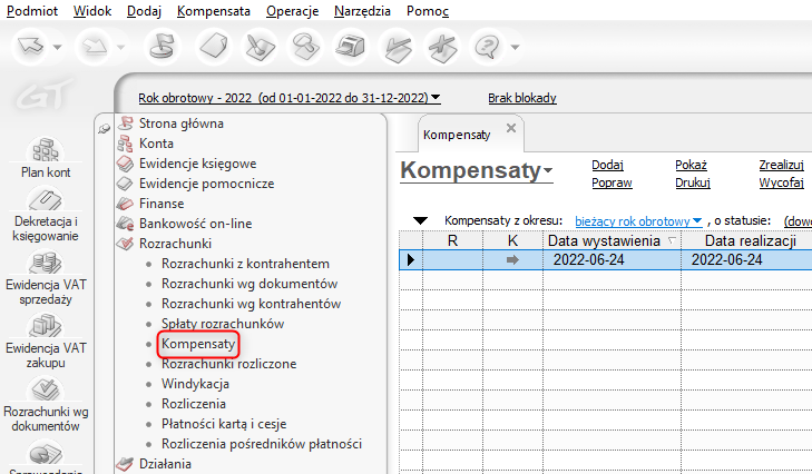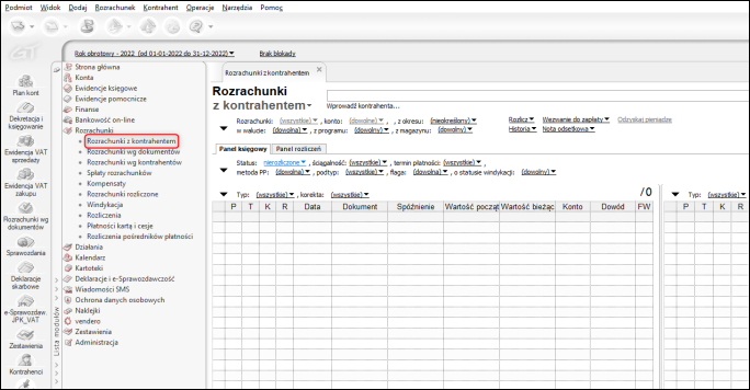 Moduł obrazujący stan rozrachunków z wybranym kontrahentem. Po lewej stronie wyświetlane są należności i spłaty zobowiązania, a po prawej – zobowiązania i spłaty należności. Klikając na rozrachunek prawym przyciskiem myszy, użytkownik może go m.in.: rozliczyć (przez utworzenie dokumentu, skojarzenie, zbiorczo), sprawdzić historię rozliczenia, podejrzeć dokument źródłowy lub historię księgowania.
