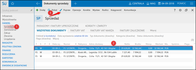1. W odpowiednim module (w tym przykładzie Sprzedaż) zaznaczyć odpowiedni dokument i kliknąć górne menu Popraw.