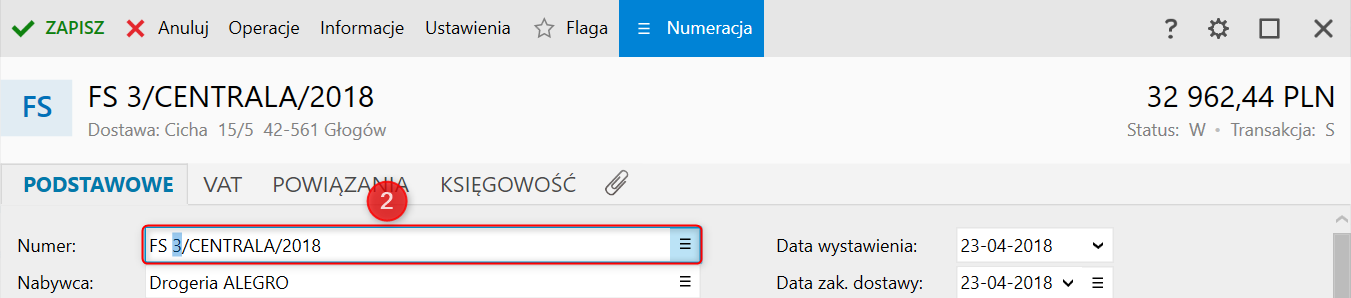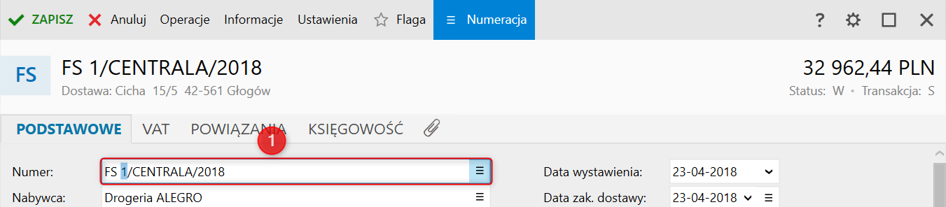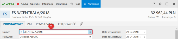 Czasem zdarzają się sytuacje, w których użytkownik musi usunąć jedną, z wcześniej wprowadzonych dokumentów. W takim przypadku powstaje luka w numeracji. Luki w numeracji można uzupełniać automatycznie lub ręcznie. Aby ręcznie zmienić numer dokumentu (na przykładzie faktury sprzedaży), należy: