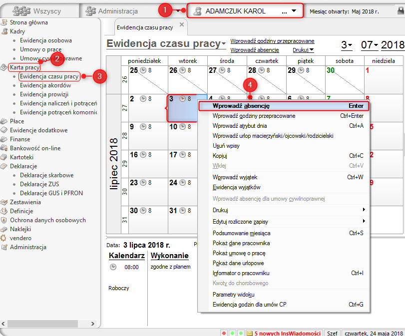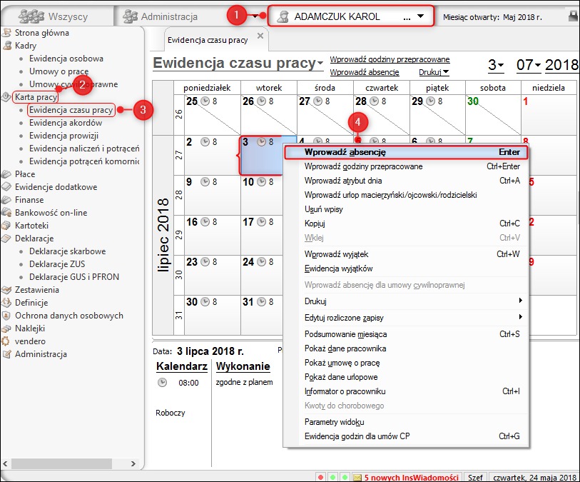 1. W kontekście konkretnego pracownika przejść do modułu Karta pracy – Ewidencja czasu pracy. Wybrany dzień kliknąć prawym przyciskiem myszy i wybrać opcję Wprowadź absencję.