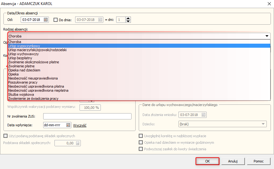 2. W oknie, które się pojawi wybrać odpowiedni Rodzaj absencji. Zmiany zatwierdzić przyciskiem OK.