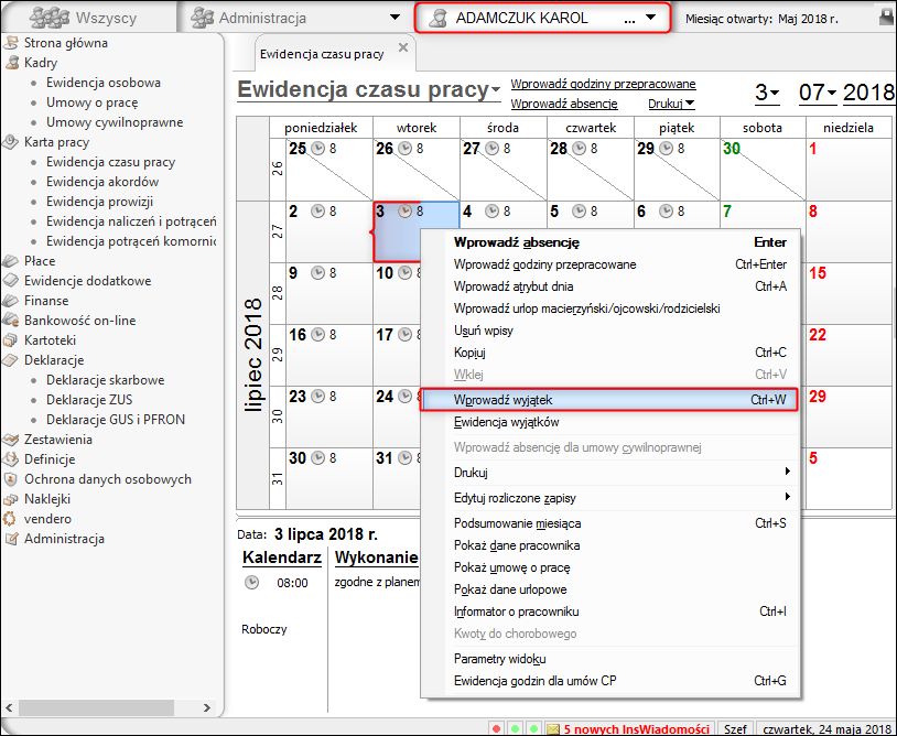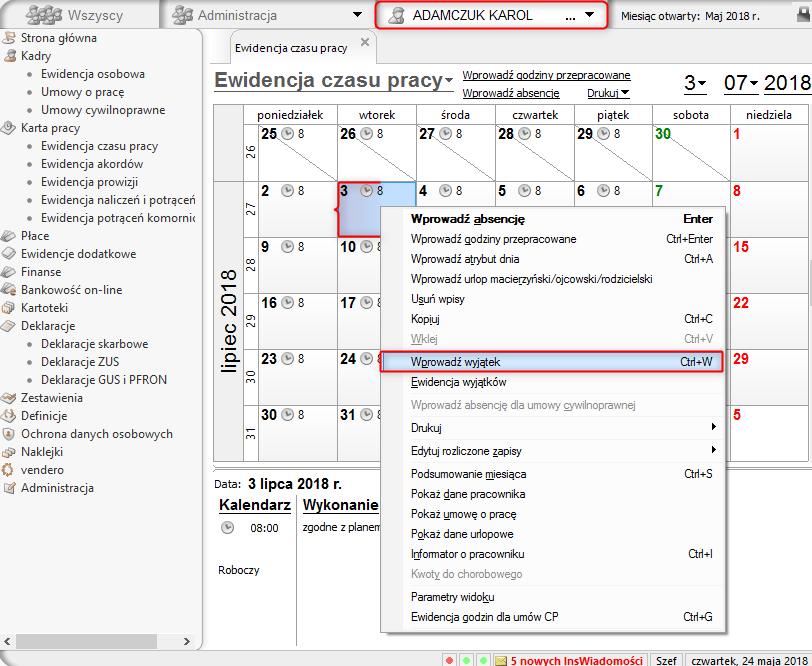 1. W kontekście konkretnego pracownika przejść do modułu Karta pracy – Ewidencja czasu pracy. Wybrany dzień kliknąć prawym przyciskiem myszy i wybrać opcję Wprowadź wyjątek.